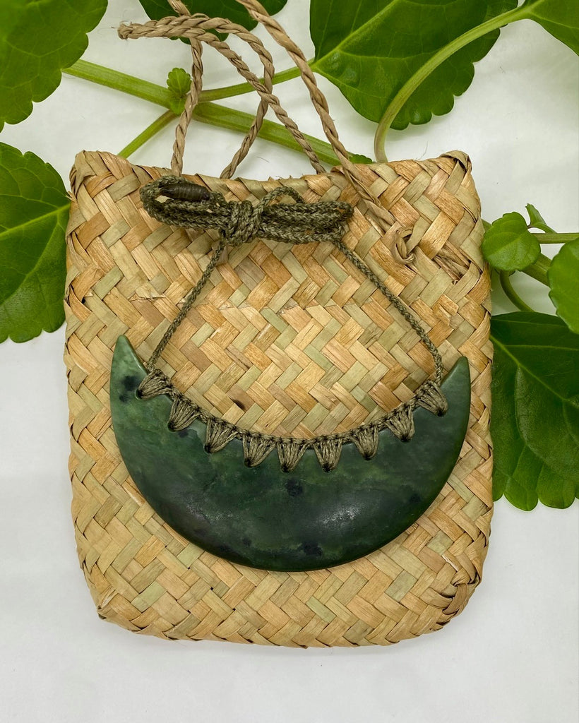 New Zealand Greenstone sourced from the West Coast of South Island, New Zealand. Presented in a flax kete.